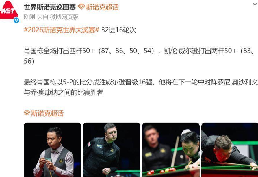 这场比赛的数据说明了一切。 肖国栋打出了四杆50 (87,86,71,50),进攻成功率和长台进球率在关键时刻都压过了威尔逊。 他赢得不仅仅是比分,更是在控球、防守和关键时刻的心理博弈上,取得了完胜。 这场胜利,让肖国栋成为了本届香港大奖赛第一位闯入16强的中国选手。