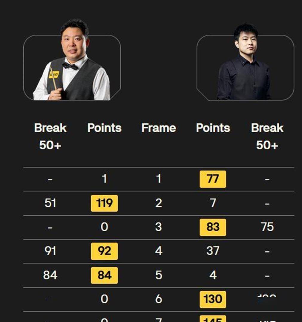 然而赵心童在第六局和第七局连续轰出单杆130分和145分,瞬间将比分改写为4-3。 关键时刻,张安达顶住压力,在第八局再次打出单杆84分,顽强追平比分。